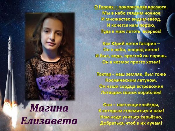 Міне, осындай таланттар бар! "Әдебиеттік оқу" сабағында 4 сыныпта оқушылары шығармашылық тапсырманы орындады. Олар ғарышты игерген кейіпкерлер туралы өлеңдер жазды . Ең жарқын жұмыс Магина…
