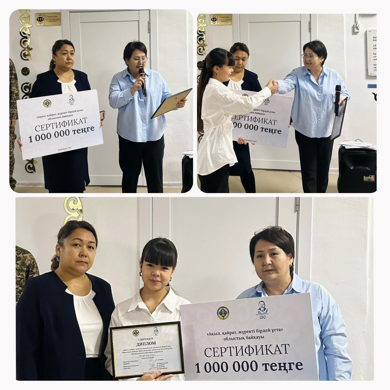 Мектебіміздің мақтанышы, оқушыларға үлгі болатындай Ұлы ақын, ойшыл Абай Құнанбайұлының 180 жылдығына арналған «АҚЫЛ, ҚАЙРАТ, ЖҮРЕКТІ БІРДЕЙ ҰСТА» облыстық байқауында “Көркемсөз шебері” номинациясы бойынша 1-орын жеңімпазы, жүлде қоры — 1 000 000 теңге ие