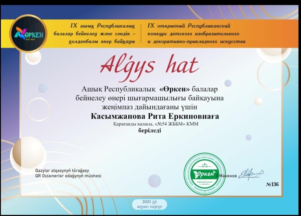 Құттықтаймыз! «ӨРКЕН» IХ Ашық Республикалық балалар бейнелеу және сәндік – қолданбалы өнер көрме-байқауының, «Ертегілер мен аңыздар әлемінде» номинациясында