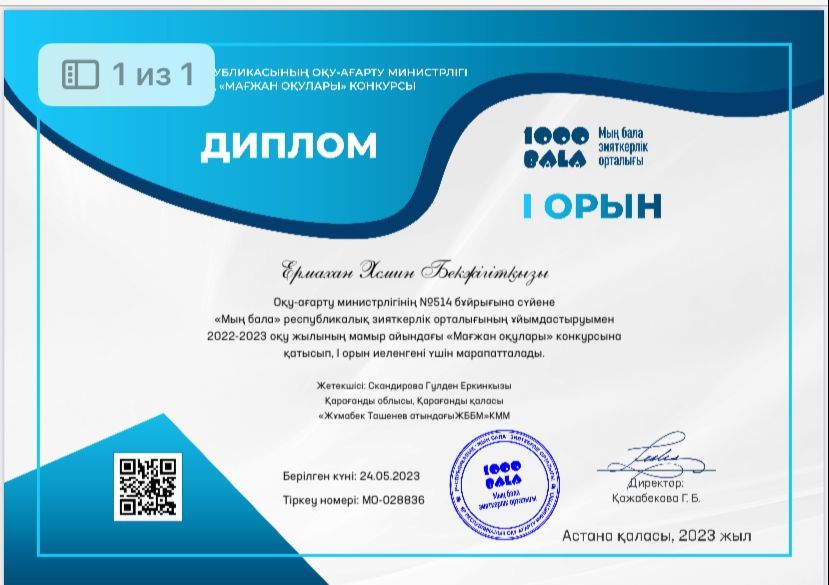 “Мың бала”республикалық зияткерлік орталығының ұйымдастыруымен 2023 жылғы мамыр айындағы “Мағжан оқулары” конкурсына қатысып,