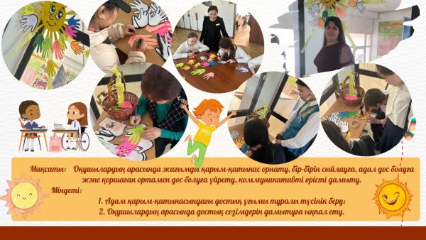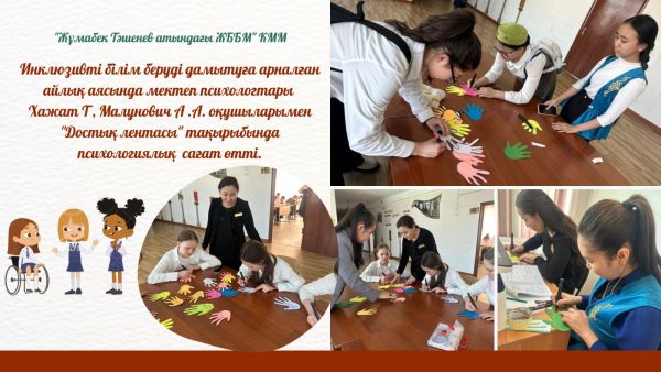Инклюзивті білім беруді дамытуға арналған айлық аясында мектеп психологтары Хажат Т , Малунович А .А. оқушыларымен "Достық лентасы" тақырыбында психологиялық сағат өтті.