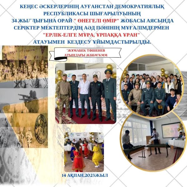 ✍️2023жылдың ақпан айының 14күні "Жұмабек Тәшенев атындағы ЖББМ"КММ -де Кеңес әскерлерінің Ауғанстан Демократиялық Республикасы шығарылуының 34 жылдығына орай Өнегелі өмір жобасы аясында серіктес мектептердің АӘД пәнінің мұғалімдерімен "Ерлік- елге мұра,