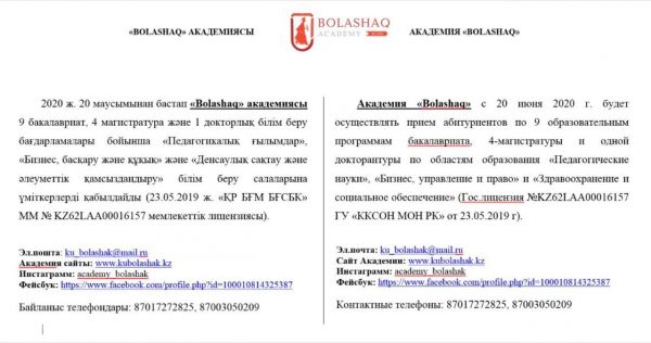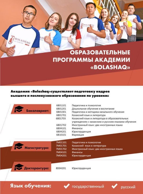 Маусым айынан бастап «Bolashaq» академиясы 9 бакалавриат, 4 магистратура және 1 докторлық білім беру бағдарламалары бойынша «Педагогикалық ғылымдар», «Бизнес, басқару және құқық» және «Денсаулық сақта…
