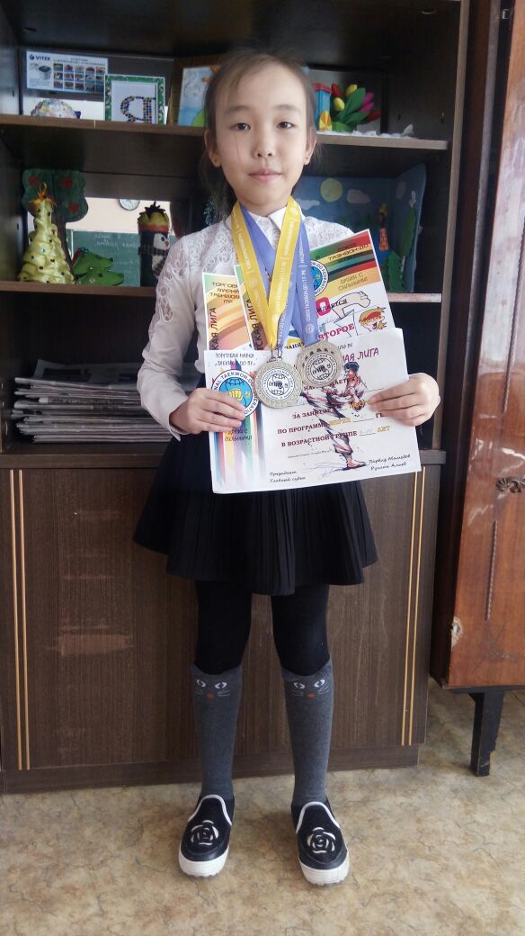 Караулова Акбота  ученица 4 Д класса 2,2 и 3 местав национальной детской лиге по таэквон-до, республиканский конкурс