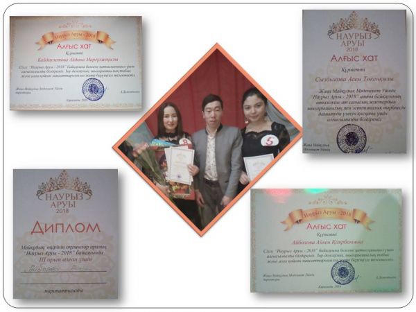 Майқұдық өңірінің оқушылар аралық "Наурыз Аруы-2018" байқауында III орынға ие болған Айболова Айкен және Алғыс хатпен Айболова Айкен мен Байдаулетова Айдана сонымен қатар осы байқауы…