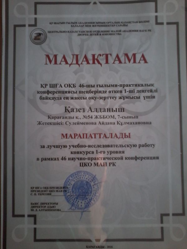 №54 ЖББОМ,7-сынып оқушысы Қазез Алданыш ҚР ШҒА ОҚБ 46-шы ғылыми-практикалық конференциясы щеңберінде өткен 1-ші деңгейлі байқауда ең жақсы оқу-зерттеу жұмысы үшін марапатталды.