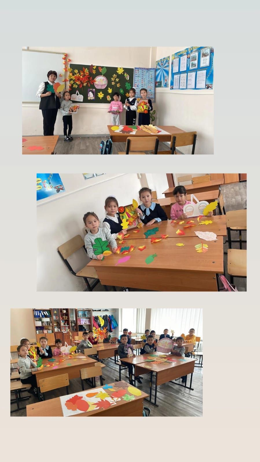 3 сынып оқушылары күзгі жапырақтардан әртүрлі жапсырма жұмыстар жасады