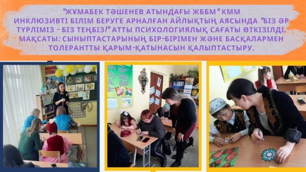 "Жұмабек Тәшенев атындағы ЖББМ" КММ Инклюзивті білім беруге арналған айлықтың аясында "БІЗ ӘР ТҮРЛІМІЗ - БІЗ ТЕҢБІЗ!" атты психологиялық сағаты өткізілді.