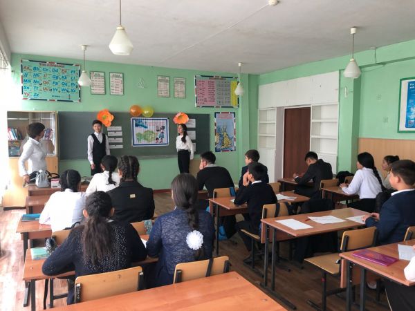 06.09.18ж.ҚР Тілдер күніне арналған апталықтың жоспары бойынша қазақ тілі мен әдебиеті пәнінің мұғалімдері Сулейменов Г.Б. және Канафина Б.С. 8-9 орыс сыныптар арасында "Тіл және қоғам" ат…