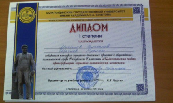 Был награжден Диплом I степени Михалев.В, Щеглов.Р победитель конкурса проектов в общественно-политической сферы Республики Казахстан" Казахстанская модельтрансформации:социально-политический к…