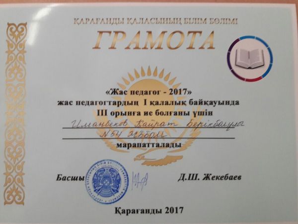 І қалалық жас педагогтардың "Жас педагог-2017" байқауына қатысып, III орынға ие болған қазақ тілі және әдебиет пәнінің мұғалімі Иманбеков Қайрат Берікболұлын құттықтаймыз!