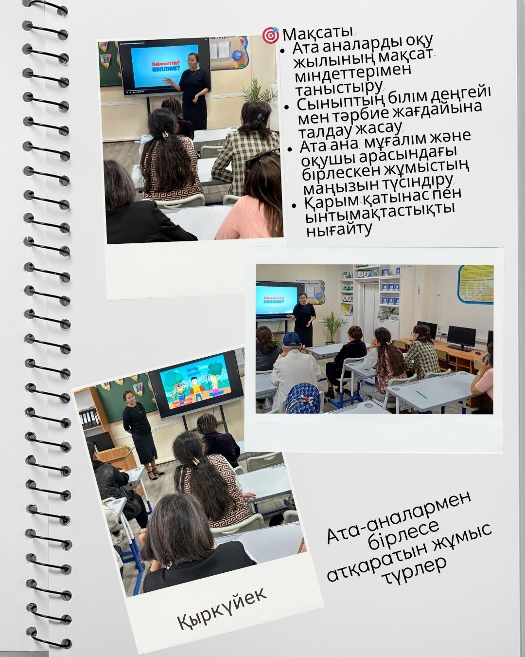 Ата-аналарға мектеп психологының жұмысы, міндеттері және оқушылармен жүргізілетін іс-шаралар туралы ақпарат берілді