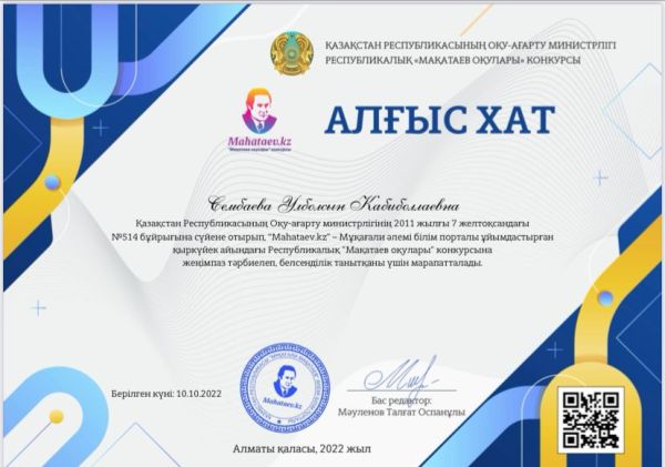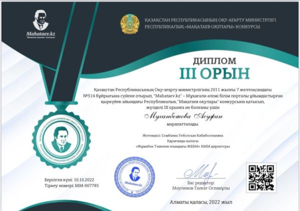 Қазақстан Республикасы Білім және ғылым министрінің 2011 жылғы 7 желтоқсандағы №514 бұйрығына сүйене отырып, “Mahataev.kz” – Мұқағали Мақатаев әлемі білім порталы ұйымдастырған қыркүйек айындағы Республикалық "Мұқағали оқулары" конкурсына қатысып жүлделі