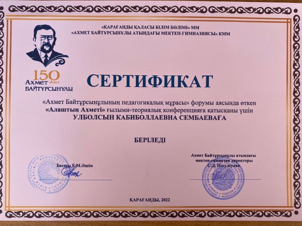 «Ахмет Байтұрсынұлының ғылыми-педагогикалық мұрасы» форумы аясында өткен «Алаштың Ахметі» қалалық ғылыми-теориялық конференциясына және Республикалық "Мұқағали оқулары" конкурсына жеңімпаз тәрбиелеп, белсенділік танытқаны үшін Сембаева Улболсын Кабиболлае
