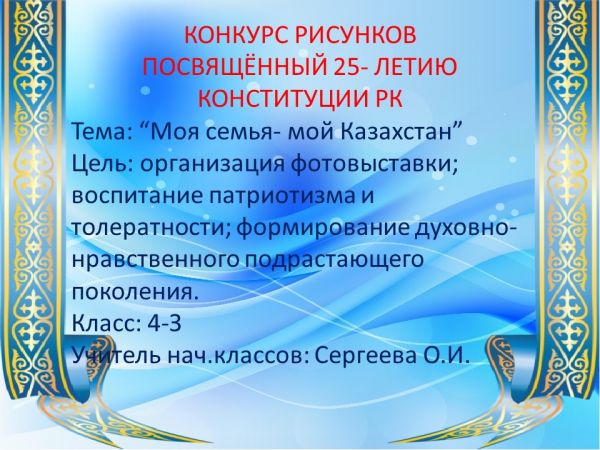 Конкурс рисунков «Моя семья-мой Казахстан» посвящённой 25-летию Конституции РК
