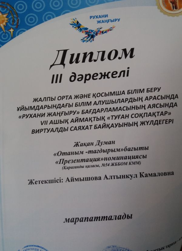 Жалпы орта және қосымша білім беру ұйымдарындағы білім алушылардың арасында " Рухан жаңғыру" бағдарламасының аясында VII ашық аймақтық "Туған соқпақтар" виртуалды сая…