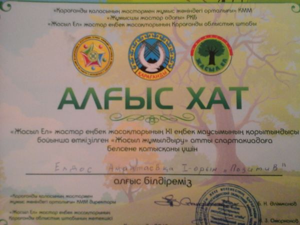 "Жасыл Ел" жастар еңбек жасақтарының ХІ еңбек маусымының қорытындысы бойынша өткізілген "Жасыл жұмылдыру" атты спартакиадаға белсене қатысқан №54 ЖББОМ КММ-нің 11 "А" с…