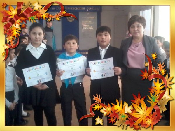 Халықаралық қашықтық олимпиадада "Информатика" пәніне қатысқаны үшін Сагит Лейла 7Б сертификатпен марапатталды, Оспан Ераслан, Қасымов Ерік 6А және информатика пәні мұғалімі Исабекова Жана…