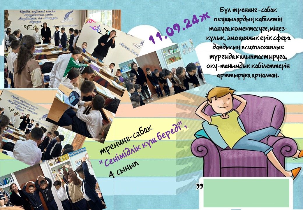 Бұл тренинг -сабақ оқушыларды ойын-жаттығулар арқылы, көзқарасын қалыптастыруға, қабілетін тануға көмектесуге,мінез-құлық, эмоциялық ерік сфера дағдысын психологиялық тұрғыда қалыптастыруға, оқу-тан…