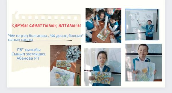 " Қаржы әлемі " қаржылық сауаттылық апталығы аясында 1Б сыныбында "100 теңгең болғанша , 100 досың болсын" атты сынып сағаты өтті.