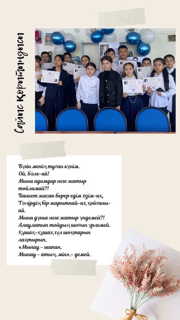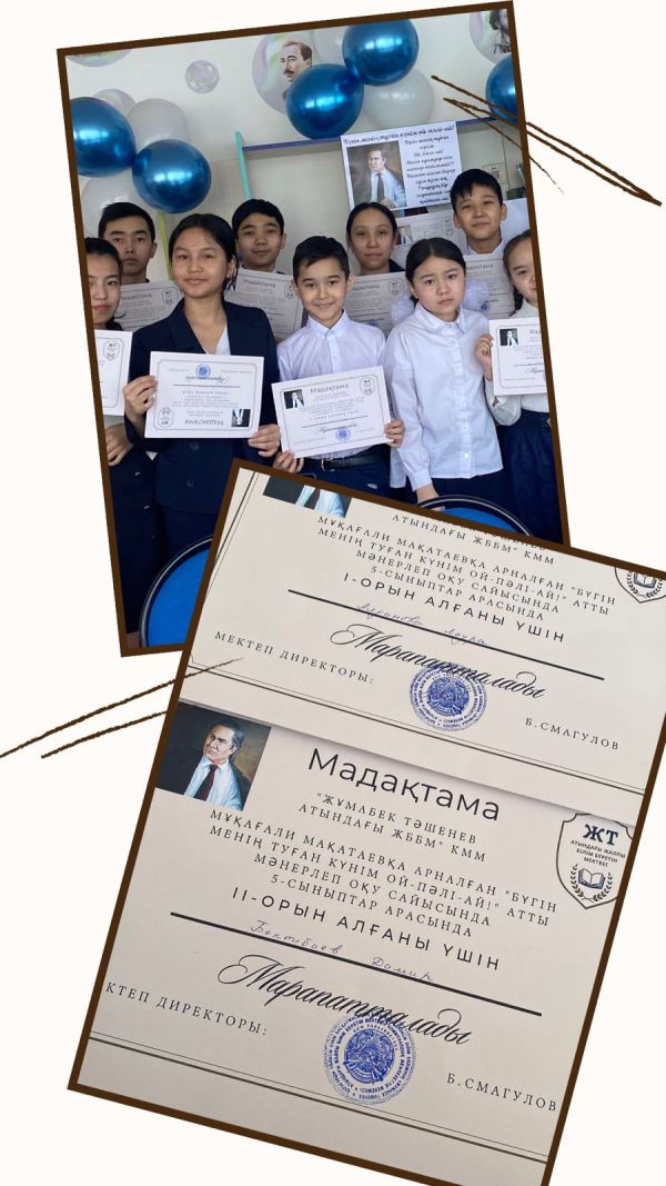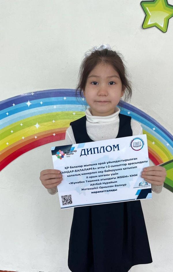 "Ж.Тәшенев атындағы ЖББМ "KMM   1"Г" сынып оқушысы Айтбай Нұрайым Қалалық мәнерлеп оқу сайысынан  ІІ орынды Дипломмен марапатталды. Жарайсын!    Жетекшіс…