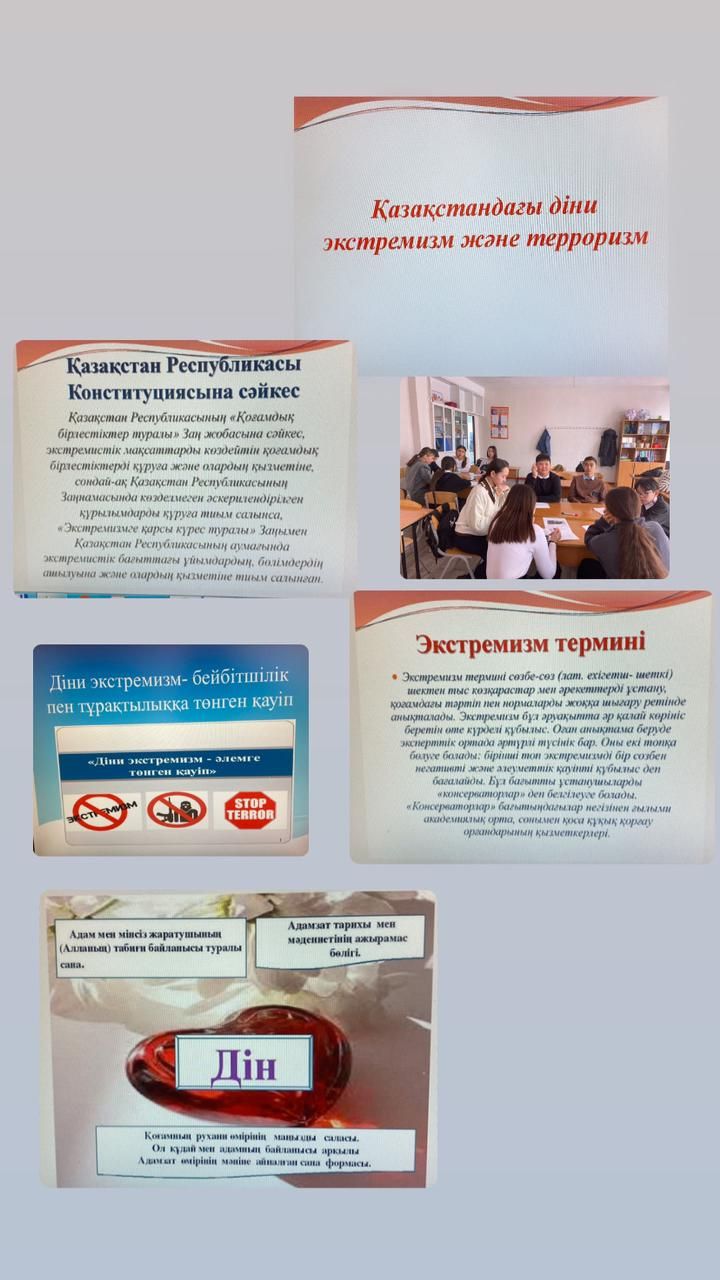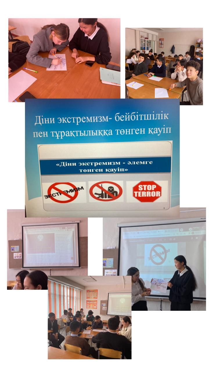 "Ж.Тәшенев атындағы ЖББМ"КММ 9 "А","Б","В" сыныптары арасында "Діни экстремизм-бейітшілік пен тұрақтылыққа төнген қауіп " деген тақырыпта біріккен сынып сағаты өтті.