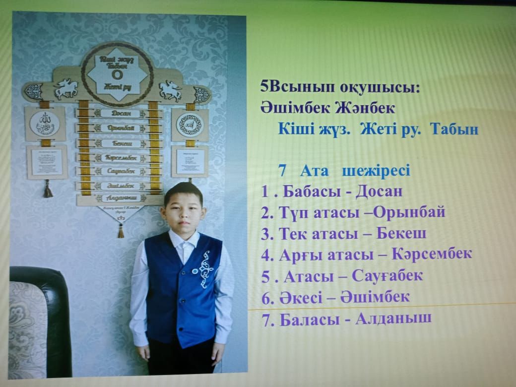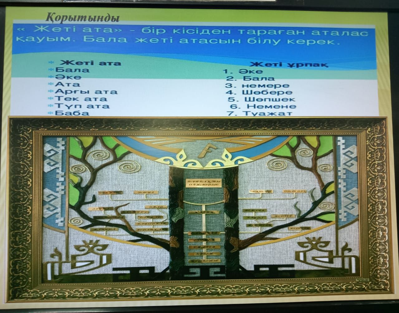 Ұлттық құндылықтарды дәріптеу мақсатында 5В сыныбында "Жеті ата және 7 ұрпақ танымы"тақырыбында таным сабағы өтілді.