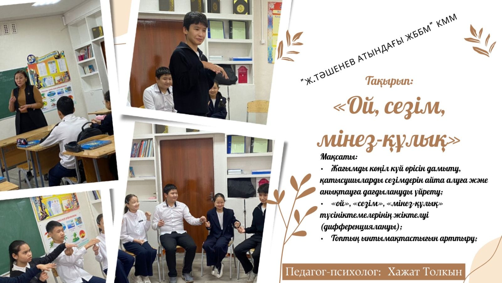 Бұл тренинг қарым-қатынас дағдысын дамытуға, өз-өзіне деген сенімділігін, жағымды қатынасты арттыруға, көңіл-күйлерін көтеруге бағытталған. Тренинг жаттығулары оқушылардың бірін-бірі түсінуін, өзін…