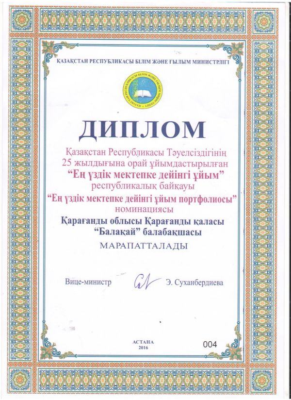 Қазақстан Республикасының Тәуелсіздігінің 25- жылдығына орай «Мектепке дейінгі балалық шақ» республика орталығында 2016 жылдың 20 қазан және 20 қараша аралығында «Ең үздік мектепке…