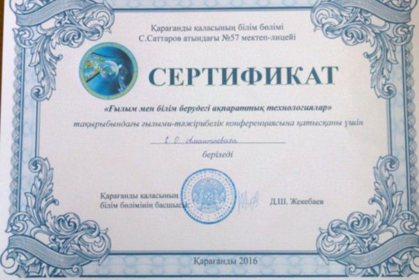 Қарағанды қаласының Білім бөлімі мен С.Саттаров атындағы №57 мектеп-лицейінде 19 ақпан 2016 жылы өткен "Ғылым мен білім берудегі ақпараттық технологиялар"атты қалалық ғылыми-тәжірбиелік ко…