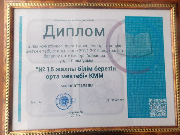 Білім жүйесіндегі  өзекті мәселелерді атқаруда жеткен табыстары және 2014-2015 оқу жылын бағалау нәтижелері бойынша үздік білім ұйым "№15 жалпы білім беретін орта мектебі" КММ марапат…