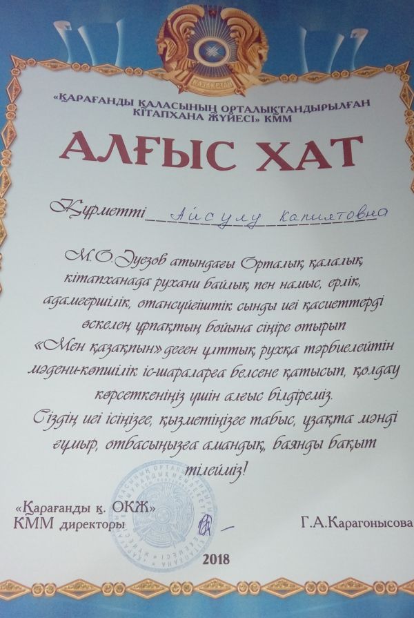1 "А" сынып оқушысы Бердалиев Бекзат Қарағанды қаласы "Томирис" спорт кешенінің ашық біріншілігінде 22 салмақ дəрежесі бойынша 3 орын алғаны үшін марапатталды