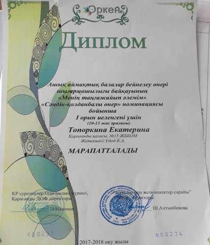 IVОткрытый региональный конкурс детского изобразительное и декоративно-прикладного искусства «Оркен» - ученица 7 класса Топоркина Екатерина заняла 1 место в технике батик (руководитель У…