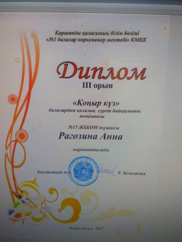 "Қоңыр күз" атты балалардың қалалық сурет байқауының жеңімпазы №15 ЖББОМ оқушысы Рагозина Анна III орын дипломмен марапатталды.