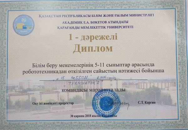 Академик Е.А. Бөкетов атындағы Қарағанды мемлекеттік университетінің ұйымдастыруымен өткен, білім беру мекемелерінің 5-11 сыныптар арасында робототехникадан өткізілген сайыстың нәтижесі бойынша мект…