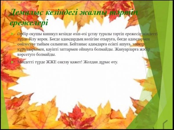 5 Әсыныбында "Күзгі демалыс кезіндегі жалпы ережелер" тақырыбында сынып сағаты өтті. Оқушылар сабаққа белсене қатысып, ой бөлісті. Сынып жетекші Абзалбекова А.Т
