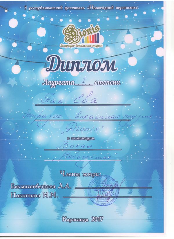 На IIIреспубликанском фестивале «Новогодний переполох» проходившего в городе Караганде, ученица 6 Б класса Пак Ева была награждена лауреатом Iстепени в номинации вокал.