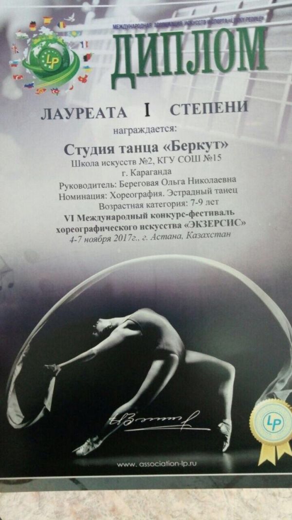 С 4 по 7 ноября в городе Астане прошёл VI Международный конкурс - фестиваль хореографического искусства "ЭКЗЕРСИС". Танцевальная группа "Беркут" СОШ №15 под руководством Берегово…