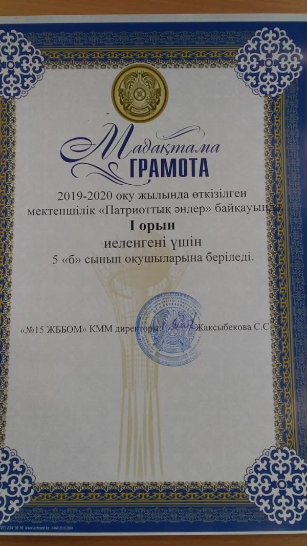 Во внутришкольном конкурсе "Конкурс патриотической песни" среди 5-6 классов 5 "Б" класс занял 1 место