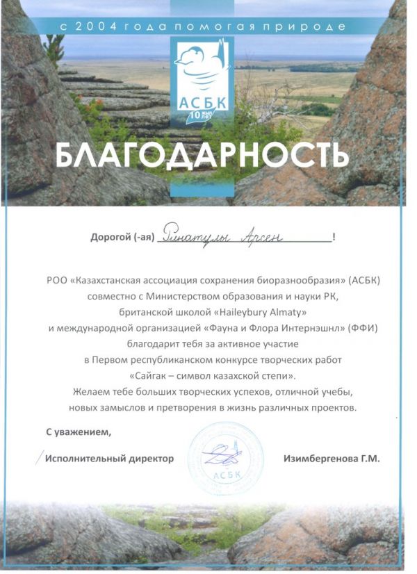 Мектеп алды даярлық тобының оқушысы Ринатұлы Арсен "Киік - қазақ даласының символы" атты республикалық шығармашылық жұмыстар байқауына қатысып алғыс хат алды.