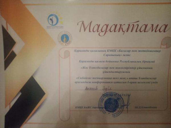 Сыбайлас жемқорлыққа жол жоқ атты Ұланбасылар арасындағы конференцияға қатысып І орын иеленгені үшін