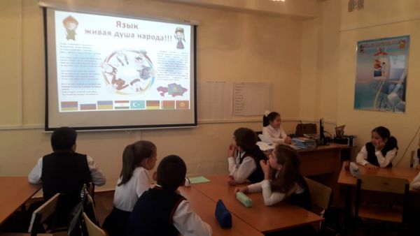 "Страна,соединившая народы".В 5В классе прошел классный час в форме игры-викторины на трех языках,посвященный Дню языков народов Казахстана.