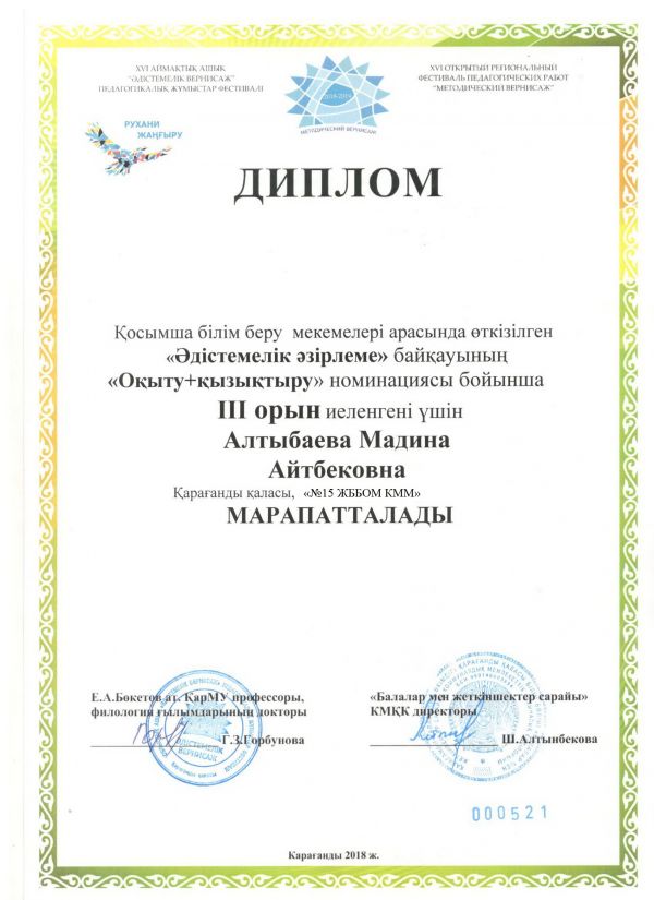 Құттықтаймыз! Қосымша білім беру мекемелері арасында өткізілген «Әдістемелік әзірлеме» байқауының «Оқыту+қызықтыру» номинациясы бойынша ІІІ орын иеленгені үшін Алтыбаева Мади…