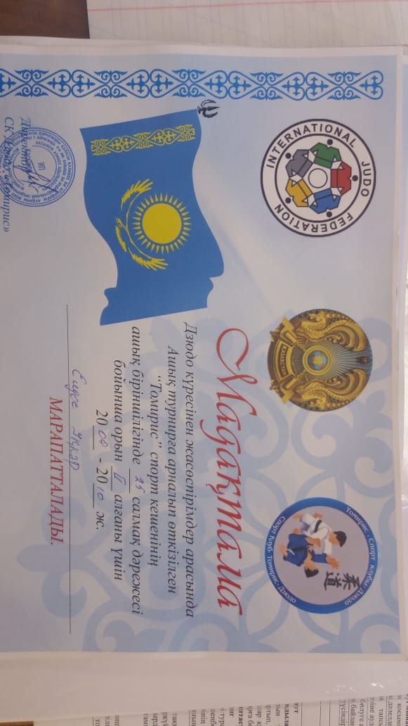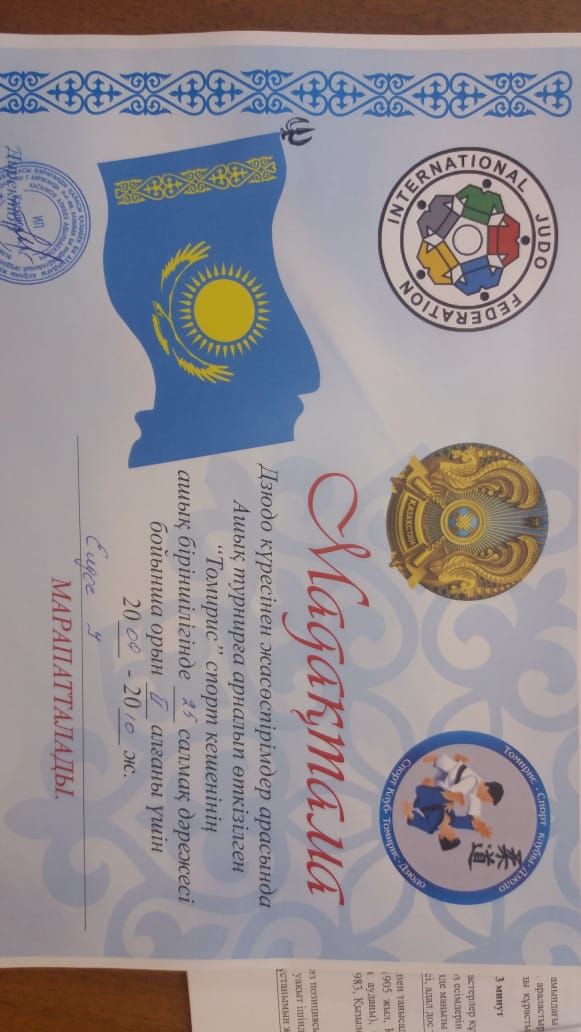 Дзюдо күресінен жасөспірімдер арасында ашық турнирге арналып өткізілген "Томирис" спорт кешенің ашық біріншілігінде ер балалар арасында 23 кг салмақ дәрежесі бойынша 3 орын иеленгені үшін…