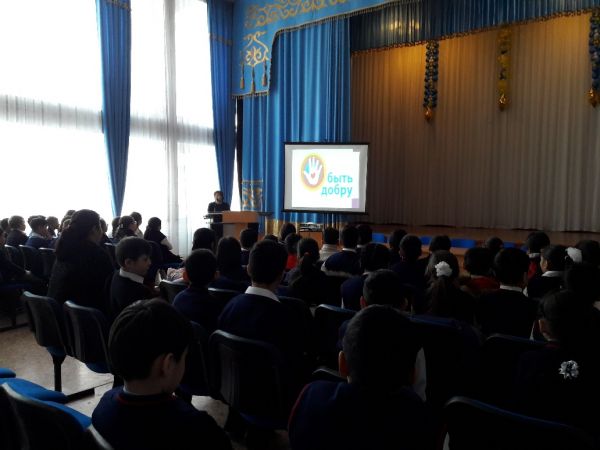 С учащимися 4-х классов учителя самопознания в актовом зале организовали беседу «Быть добру» через показ видеороликов о доброте, о праведном поведении: «Совесть», «Делай добро и оно к тебе вернется», «Урок мудреца» и т.д.