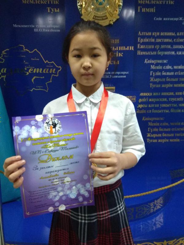 На I Международном фестивале - конкурсе детского творчества "Жас талант" ученица 6 класса была награждена дипломом I степени в эстрадном вокале. Поздравляем!