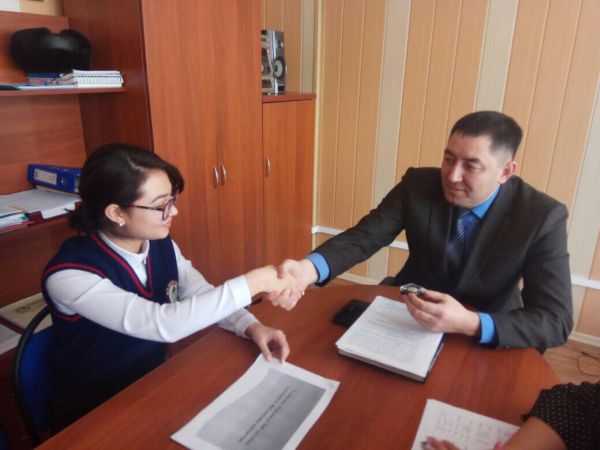 Бугін мектебіміздің оқушылар арасынан сайланған мектеп президенті Курманкулова Сабина мен Арман Болатовичтің кездесуі отті.