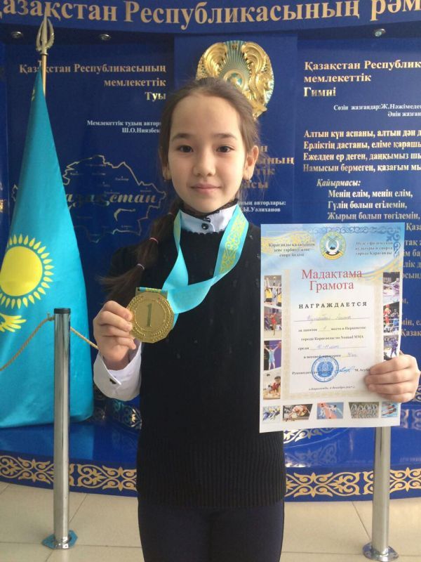 Награждается Кунанбай Амина за занятое І место в Первенстве г.Караганды по NOMAD MMA в весовой категорий 30кг.