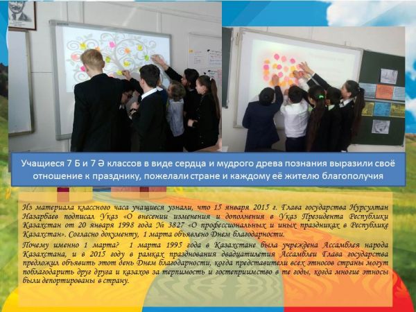 1 Наурыз Алғыс айту күні қарсаңында мектепте әр түрлі іс шаралар, атап айтсақ, спорттық сайыстар, сынып сағаттары, оқушылардың шығармашылық көрмесі ұйымдастырылды.