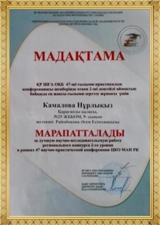 ҚР ШҒА ОҚБ 47 –ші ғылыми-практикалық конференция шеңберінде өткен 2-ші деңгейлі аймақтық бауқауда қазақ тілі пәні бойынша мектебіміздің 9 «Ә» сынып оқушысы ең жақсы ғылыми –з…